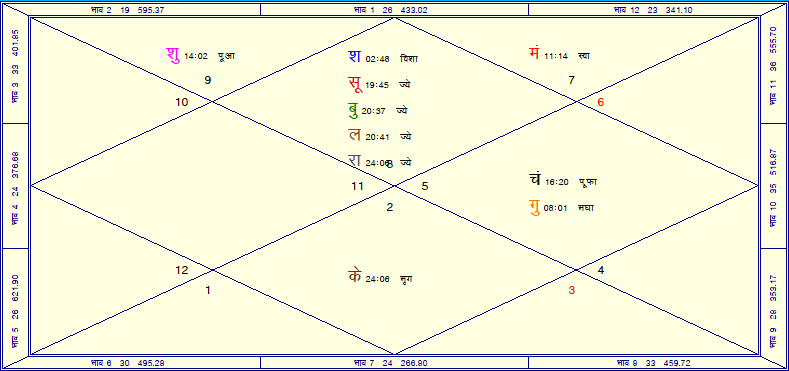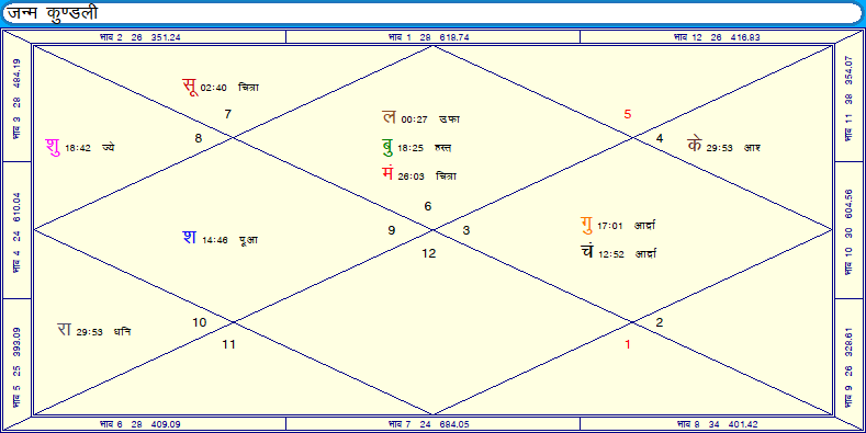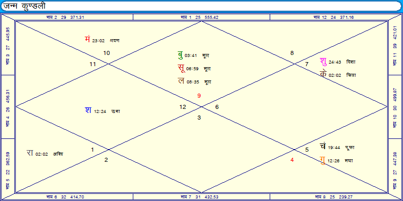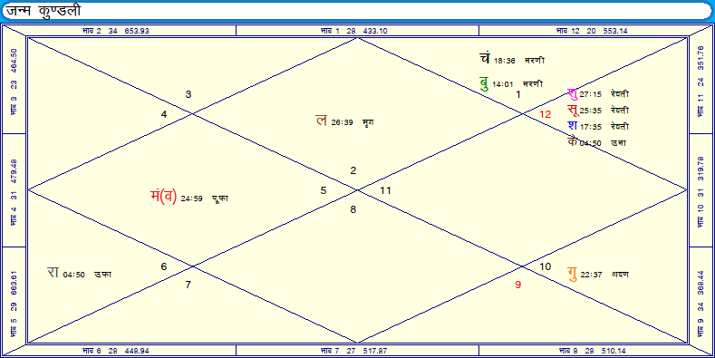 अब हम एक और जन्मपत्री देखते हैं। इस जन्मपत्री में गजकेसरी योगऔर केमद्रुम योग दोनों हैं। जन्मपत्री नीचे दी गई है। इस जन्मपत्री